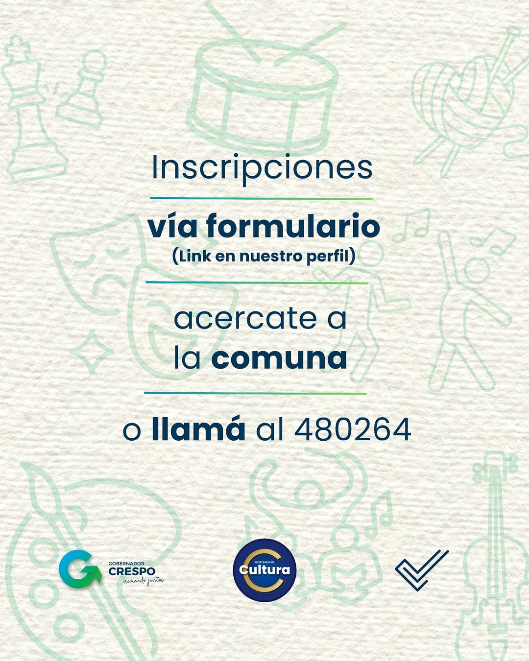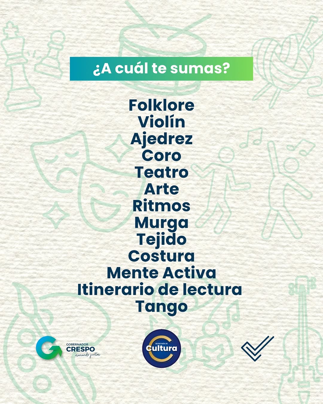 En Gobernador Crespo este año no hay excusas. Tenemos propuestas para todas las edades: música, arte, deportes mentales, danzas y oficios. Deslizá, buscá tu taller favorito en el listado y sumate.