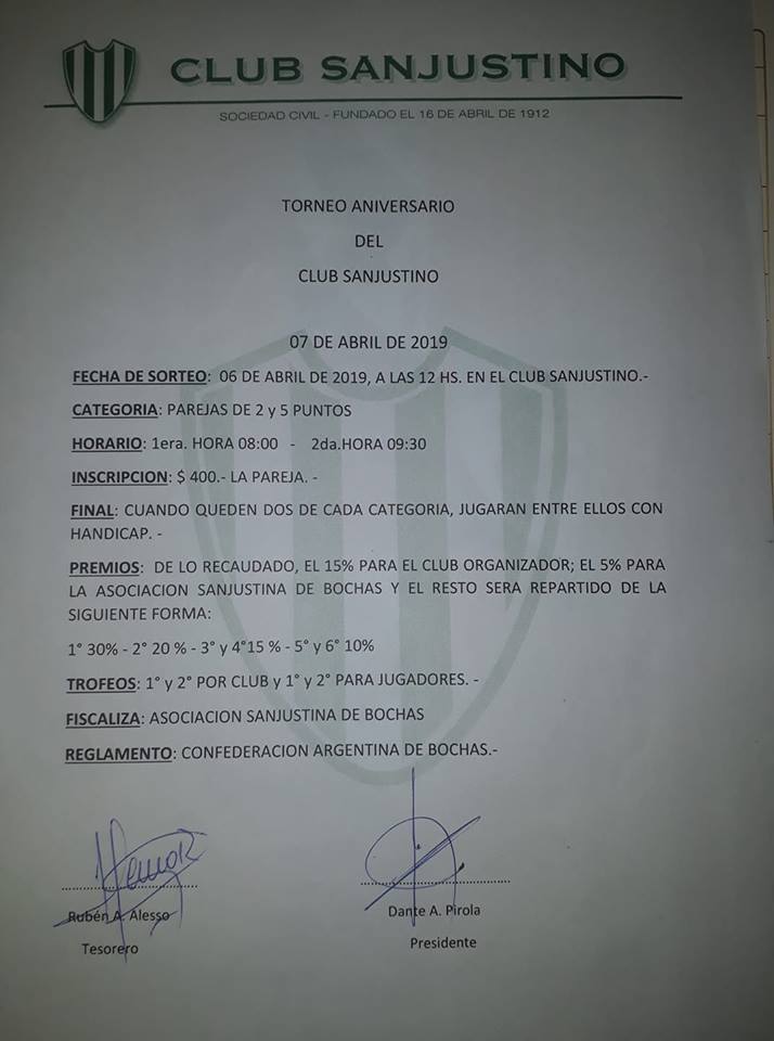 El domingo 7 de abril se llevará a cabo el torneo aniversario del Club Sanjustino, en categoría parejas de 2 y 5 puntos. El sorteo será el sábado 6 a las 12 en las instalaciones del Club.