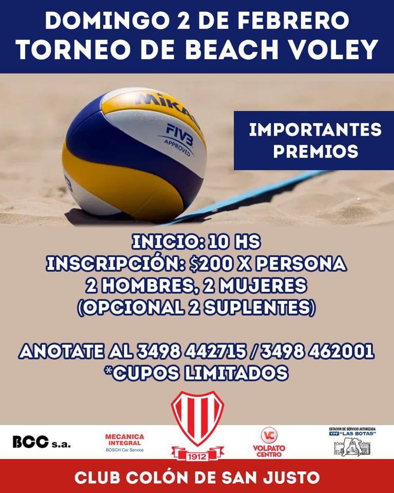 El domingo 2 de febrero cerramos el “finde” con un gran torneo de Beach Voley organizado por las chicas del club. A partir de las 10 horas comenzarán los partidos en una jornada que se extenderá hasta tarde. La inscripción tiene un costo de $200 por persona y los equipos serán conformados por 2 hombres y 2 mujeres con la opción de 2 suplentes. Podés sumar tu equipo al 3498442715 y al 3498462001 (hay cupos limitados).