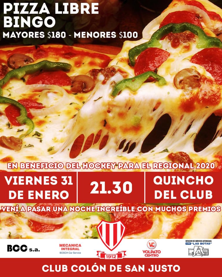 Será el viernes 31 de enero, a partir de las 21.30 horas en el quincho de pileta del club. Este tradicional evento, es en beneficio de las chicas del hockey para el Regional de Clubes 2020. El valor es de $180 para mayores y $100 para menores hasta 12 años, podrás disfrutar de pizza libre y un cartón de bingo con interesantes premios. Y si no, podés retirar tu pizza lista o cocida a un valor de $200 c/u. Las tarjetas se solicitan a las chicas de hockey del Club. No te olvides de traer tu lapicera.