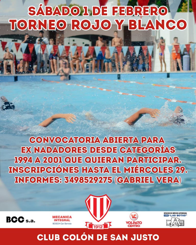 El sábado 1 de febrero se realizará una nueva edición del Torneo Rojo y Blanco de natación. Hay tiempo hasta el miércoles 29 para inscribirse y se encuentra abierta la invitación a ex nadadores desde categorías 1994 a 2001 que quieran participar. Informes e inscripciones al 3498529275 (Gabriel Vera).
