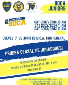 Será a cargo del departamento de captación de la entidad xeneize, este jueves 7 de junio en el Club Tiro Federal que cedió sus instalaciones para ello a partir de las 10 horas. Está destinado a las categorías 2007 – 2006 (10 AM); categorías 2005 – 2004 (11 AM) y categorías 2003 – 2002 (12 AM). La inscripción es sin cargo para los interesados.