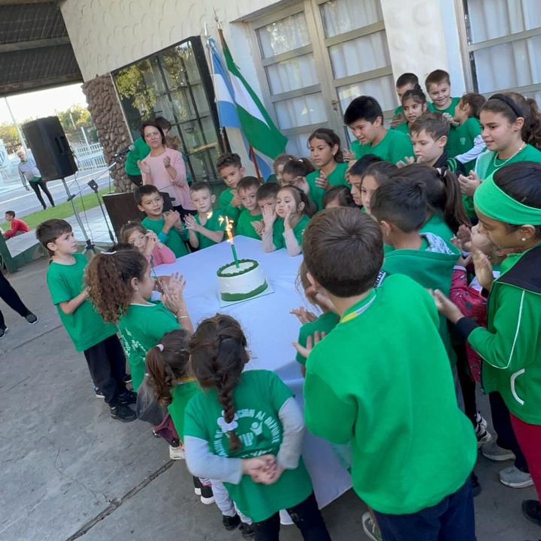Los alumnos del Jardín de Iniciación al deporte repartieron un presente con la marcha Sanjustinista para todos los asistentes y así entonar sus estrofas, también cantaron el