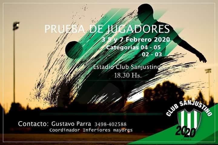 Prueba de jugadores en el Club Sanjustino: Será los días 3, 5 y 7 de febrero próximo, a las 18,30 horas en el club. Es para las categorías 2002 – 2003 – 2004 – 2005. Contacto: Gustavo Parra Coordinador de inferiores mayores de la entidad – Para mas info comunicate 📲 3498 15402588.