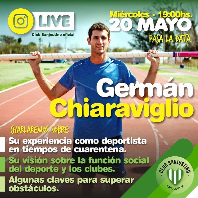 Este miércoles 👉🏻 20 de Mayo 👈🏻 conectate 🔌 y disfruta de la charla en directo , en nuestro 📺 insta live de Germán Chiaraviglio @gerchiara , Atleta Olimpico de salto con garrocha🏋🏻