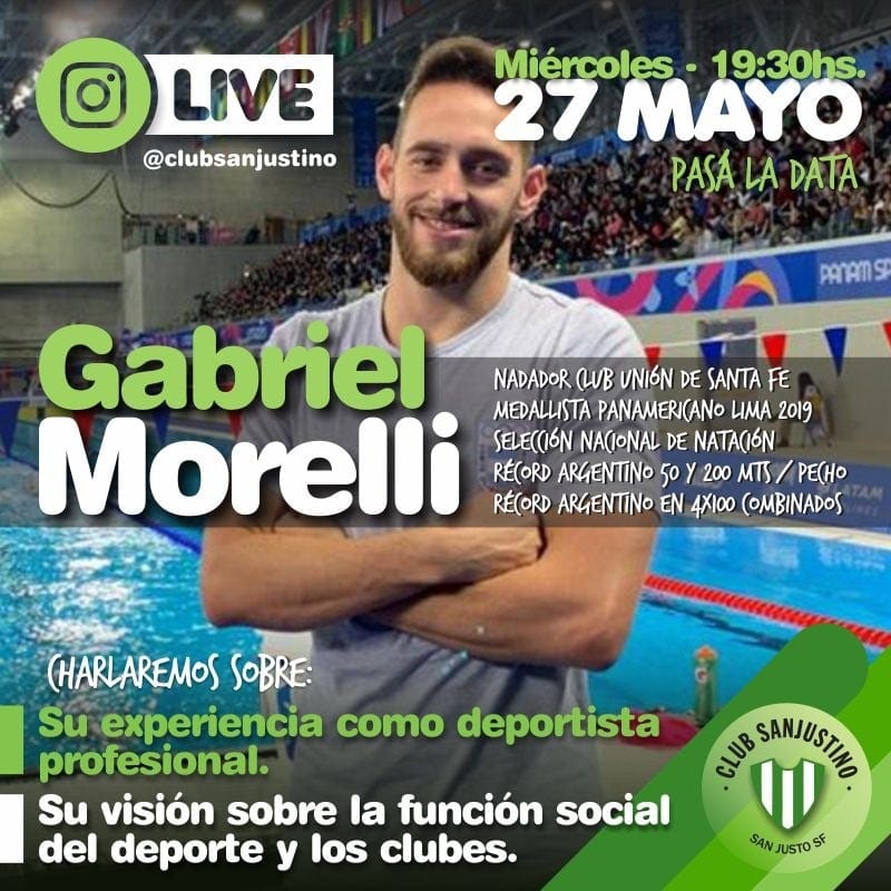Vos no te lo podes perder 😱❕ Pasa la data 📢 y agenda ✍🏻. Este miércoles 👉🏻 27de Mayo 👈🏻 conectate 🔌 y disfruta de la charla en directo, en nuestro 📺 insta live de @gabrielmorelli8 🏊🏼, nadador profesional 🏊🏼❕ No te lo pierdas🔌📢🏊🏼❕