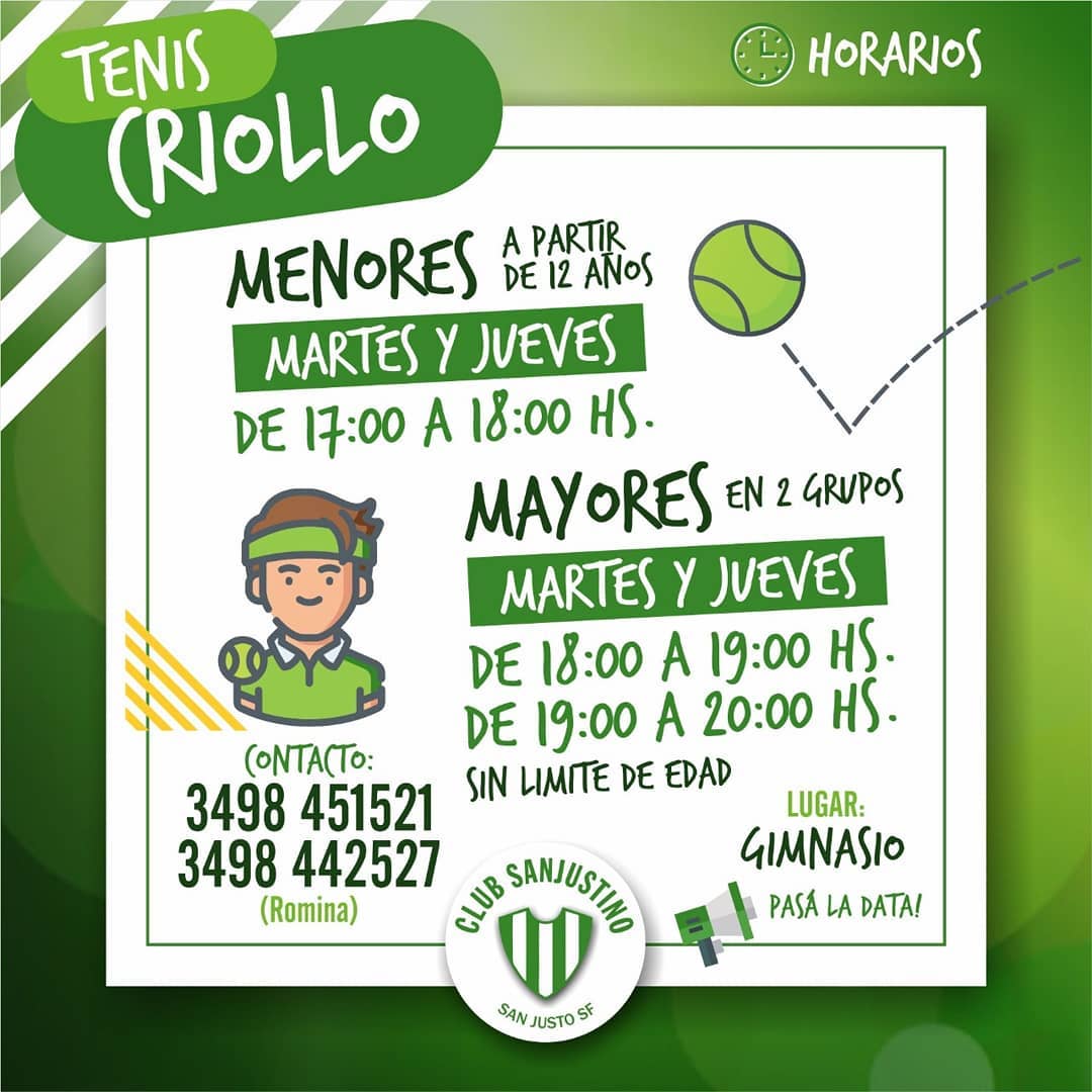 Para consultas contactarse a los teléfonos 03498 451521 y 03498 442527 o al facebook de Tenis criollo de Sanjustino.