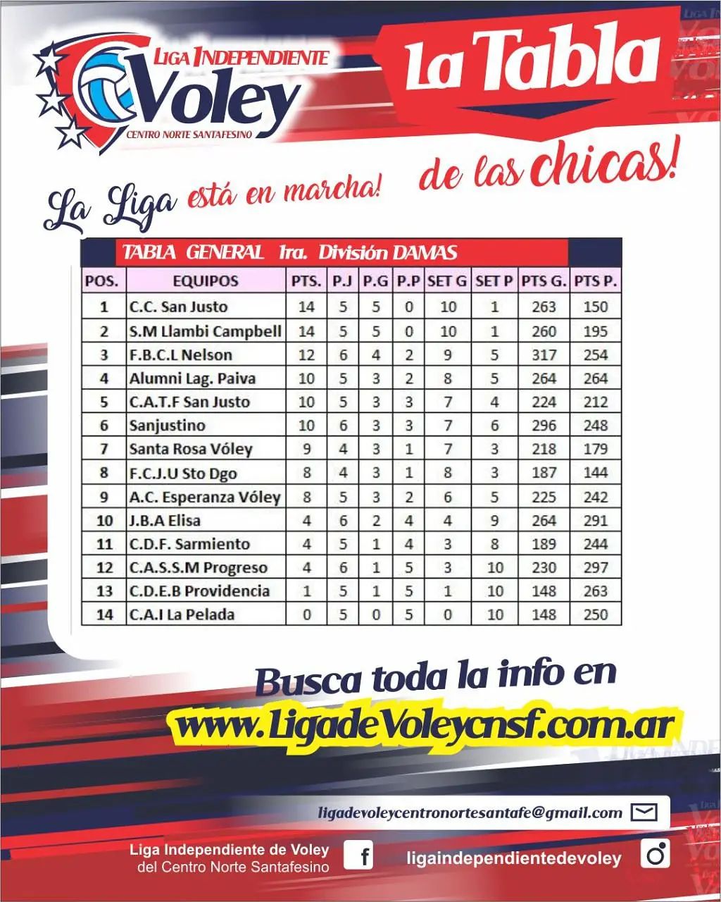 La Liga Independiente de Vóley del Centro Norte Santafesino publicó en sus redes sociales la tabla de posiciones de la primera división damas, que tiene al Club Colón de San Justo (imagen) y al Club San Martín de Llambi Campbel como punteros.