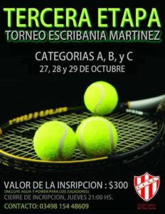 El próximo fin de semana, los días 27, 28 y 29 de octubre se realizará la tercera etapa del Torneo de Tenis “Escribanía Martínez”, en las categorías A, B y C.