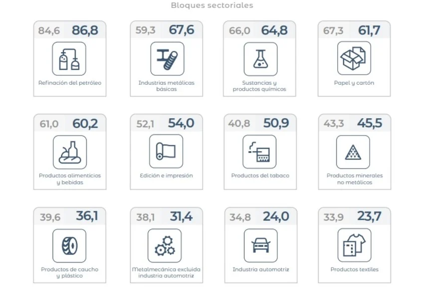 En la lectura sectorial, el informe volvió a mostrar una industria a dos velocidades: algunos bloques sostienen niveles relativamente altos, mientras otros operan con grados de ociosidad.