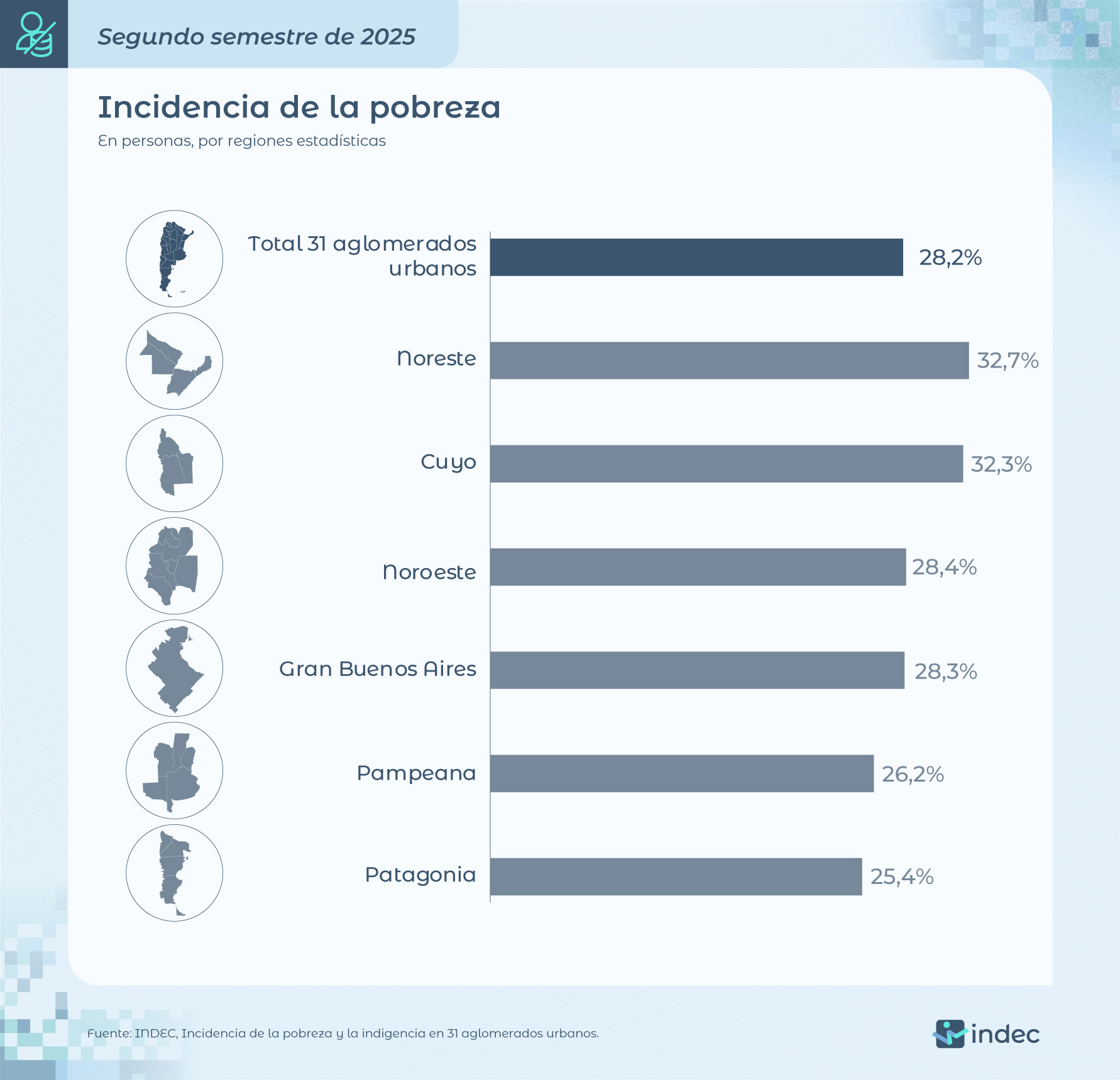 El Instituto Nacional de Estadística y Censos (INDEC) dio a conocer el nuevo índice de pobreza del segundo semestre del 2025 y bajó al 28,2%, ya que en el primer semestre había sido del 31,6%. Por lo tanto, en los últimos seis meses del último año 13,5 millones de argentinos eran pobres y tenían ingresos promedio por $783.493.