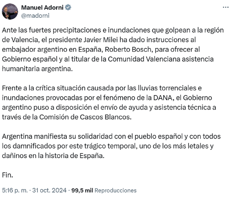 En una publicación en su cuenta de la red social X (ex Twitter), Adorni expuso que el presidente Javier Milei propuso brindar apoyo a España debido al temporal. “Ante las fuertes precipitaciones e inundaciones que golpean a la región de Valencia, el presidente Javier Milei ha dado instrucciones al embajador argentino en España, Roberto Bosch, para ofrecer al Gobierno español y al titular de la Comunidad Valenciana asistencia humanitaria argentina”, expresó.