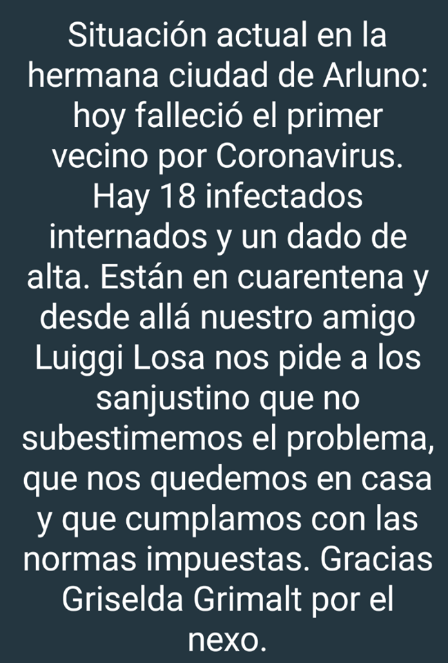 Hoy falleció el primer vecino de esa localidad italiana, hermanada con nuestra ciudad de San Justo. Además se registran 18 personas internadas con coronavirus y una dada de alta. Luiggi Losa, autoridad máxima de esa ciudad, pide a los sanjustinos no subestimar el problema y cumplir con las indicaciones de las autoridades.