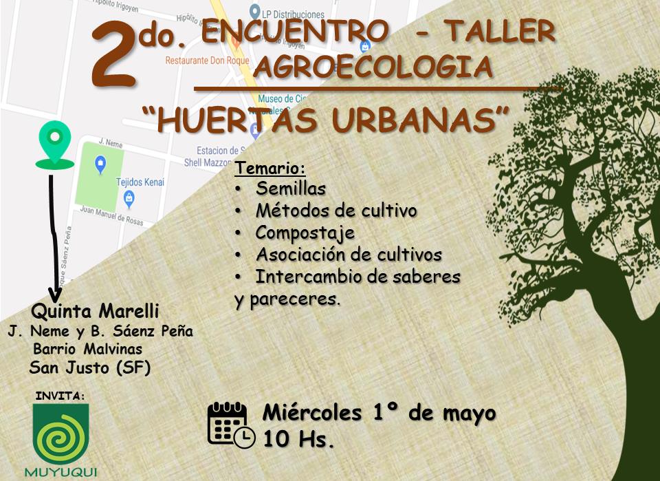 Este 1° de mayo se realizará el 2do. Encuentro-Taller de Agroecología denominado Huertas Urbanas, organizado por Muyuqui San Justo. Será a partir de las 10 horas, en el predio conocido como Quinta Marelli, ubicado en calles J. Neme y B. Saenz Peña del Barrio Malvinas.