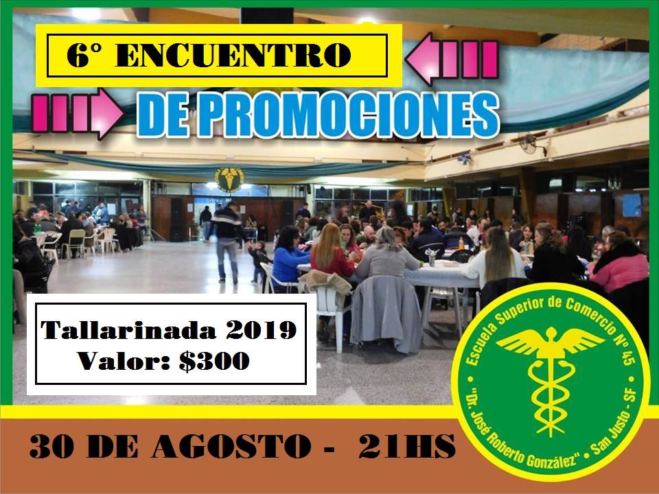El viernes 30 de agosto próximo a partir de las 21 horas, se llevará a cabo el 6to Encuentro de Promociones de la Escuela Superior de Comercio N° 45 “Dr. José Roberto González” de nuesta ciudad, con una tallarinada. Valor de la tarjeta $ 300.