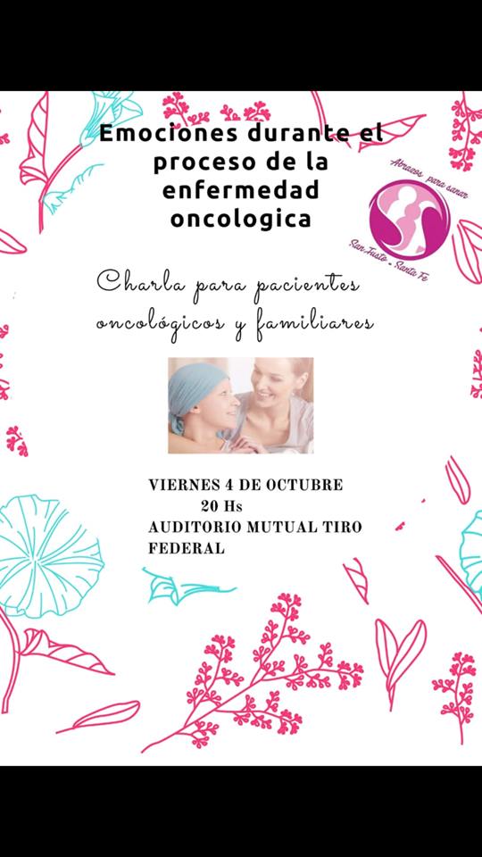 -A la noche 20 horas, tendrá lugar la charla, “Emociones durante el proceso de la enfermedad oncológica”, en el auditorio de la Asociación Mutual del Club Tiro Federal, dirigida a pacientes oncológicos familiares y público en general.