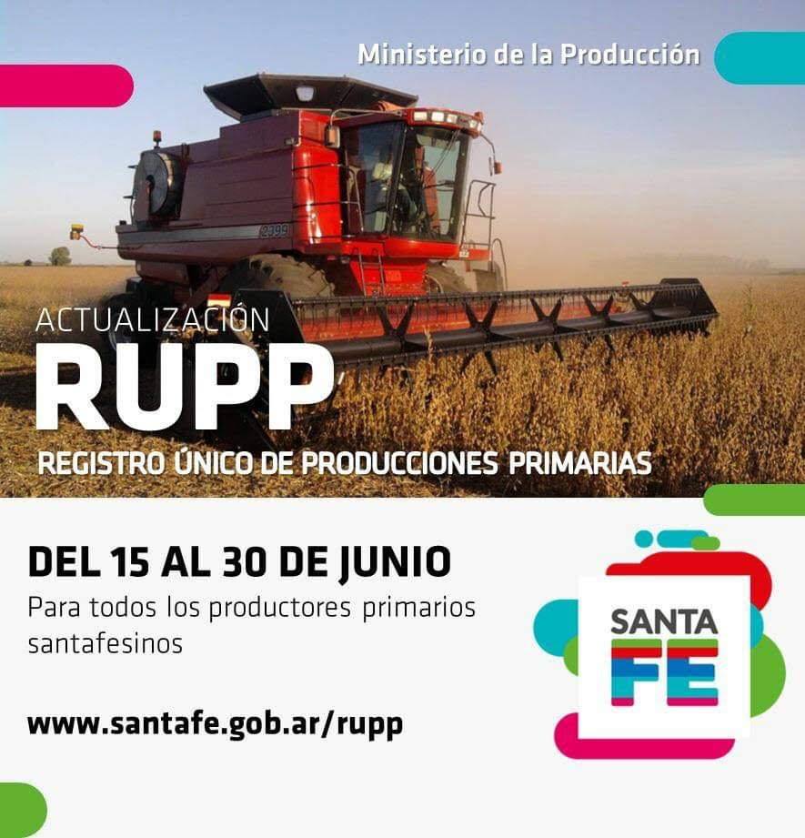 Se recuerda a los productores primarios de la provincia de Santa Fe, que hasta el día 30 de Junio deberán realizar una nueva actualización en el Registro Único de Producciones Primarias. Acceder vía internet a www.santafe.gov.ar/rupp, con su CUIT/CUIL y contraseña.