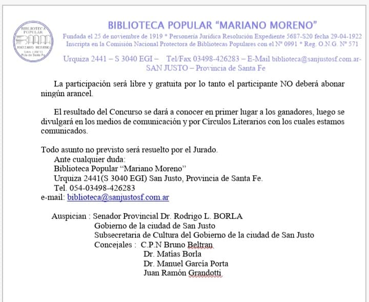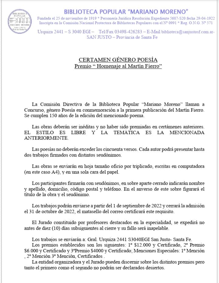 La comisión directiva de la Biblioteca Popular Mariano Moreno, llama a concurso género Poesía, en conmemoración de la primera publicación del Martín Fierro realizada hace 150 años.