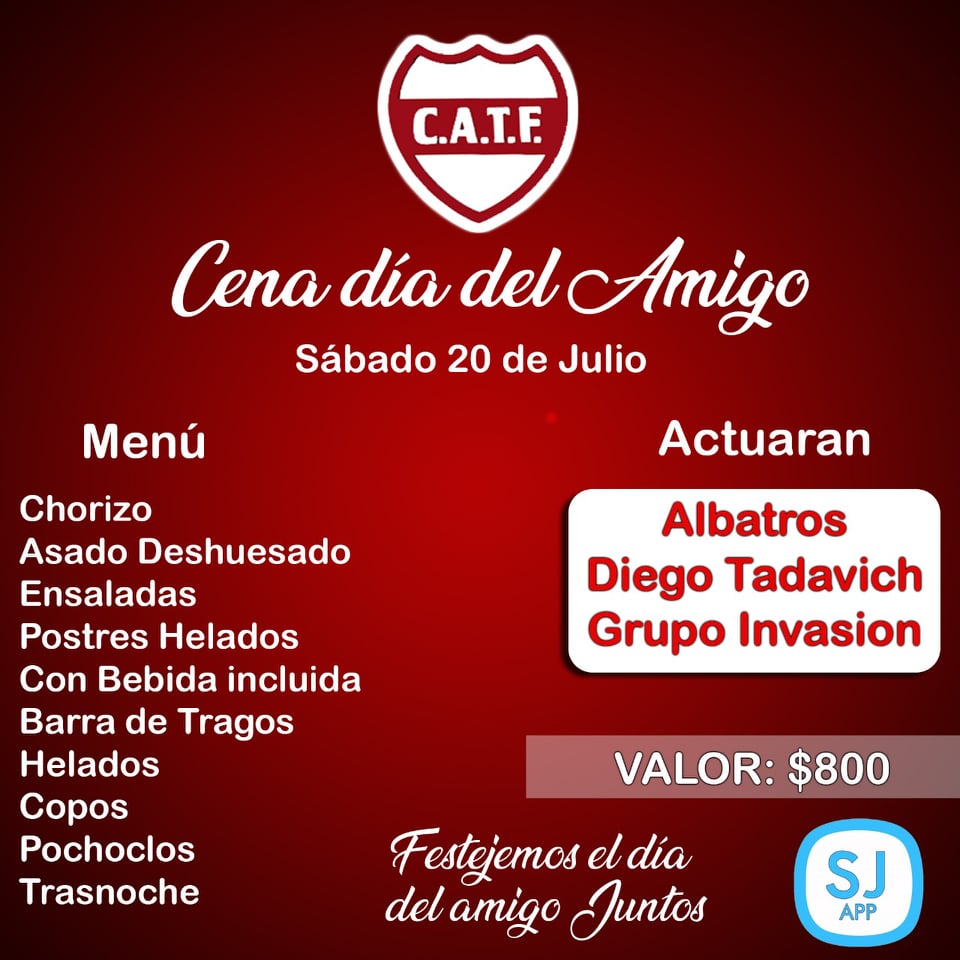 Este sábado 20 de julio el Club Atlético Tiro Federal festeja el Día del Amigo con una cena. Las tarjetas cuyo valor es de $ 800 (incluye bebida) ya pueden reservarse.