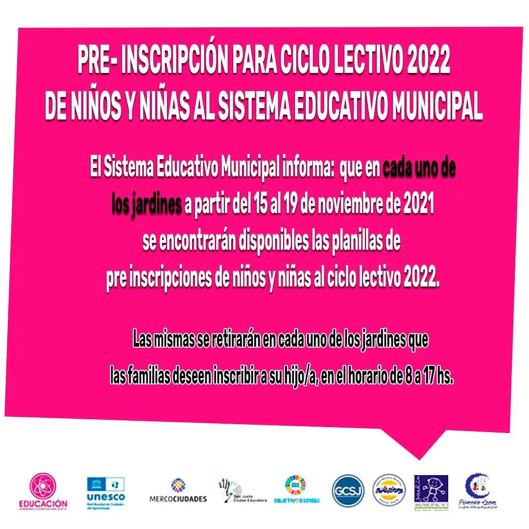 El área de @educaciongcsj informa que en cada uno de los jardines a partir del 15 Y hasta 19 de noviembre de 2021 se encontrarán disponibles las planillas de pre inscripciones de niños y niñas al ciclo lectivo 2022.