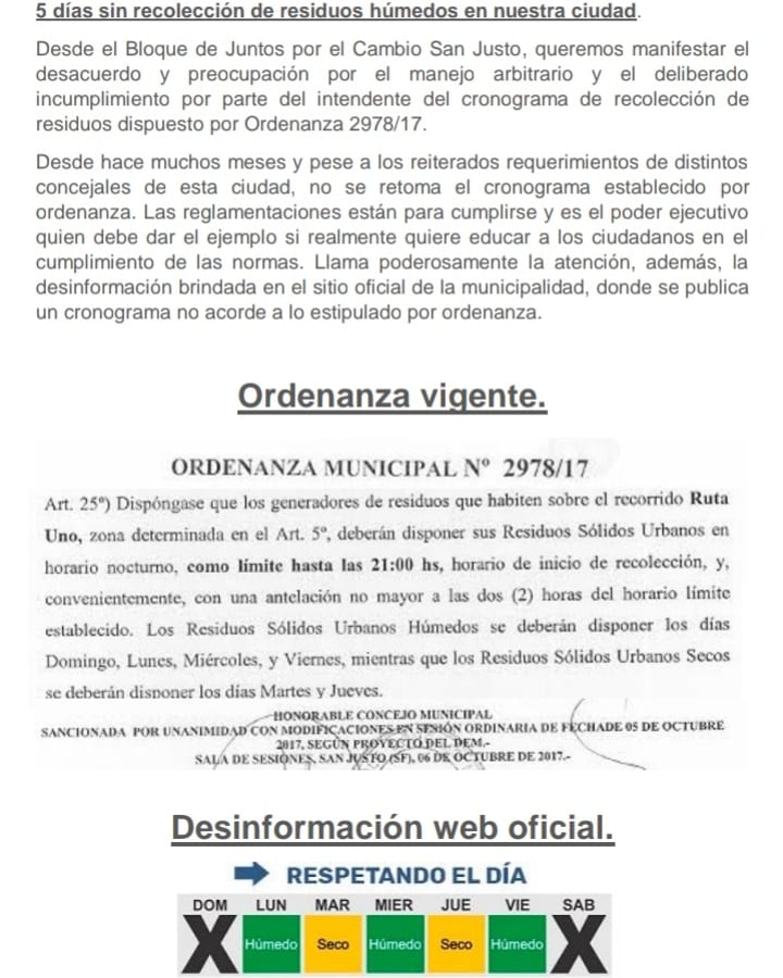Desde el Bloque de Juntos por el Cambio San Justo, queremos manifestar el desacuerdo y preocupación por el manejo arbitrario y el deliberado incumplimiento por parte del intendente del cronograma de recolección de residuos dispuesto por Ordenanza 2978/17.