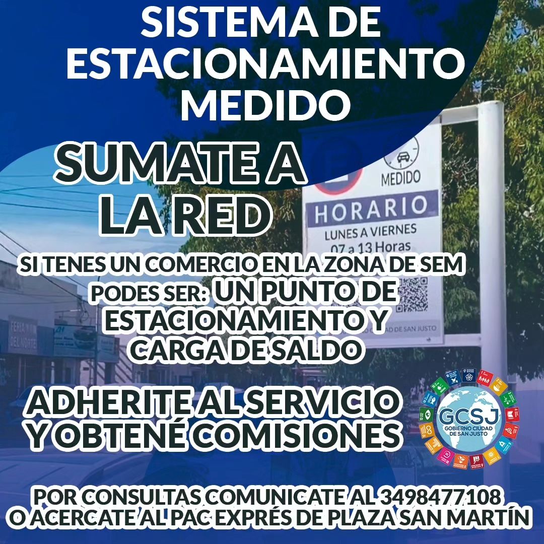 Desde este lunes 3/6, luego de tres meses de adaptación, inicia de manera oficial el SEM en el microcentro de San Justo. El Sistema funcionará de lunes a viernes de 7 a 13hs, contará con 20 minutos de gracia y los usuarios podrán registrarse, cada vez que estacionen, desde la APP “San Justo Móvil” o de manera manual en el PAC (Iriondo y 9 de julio).