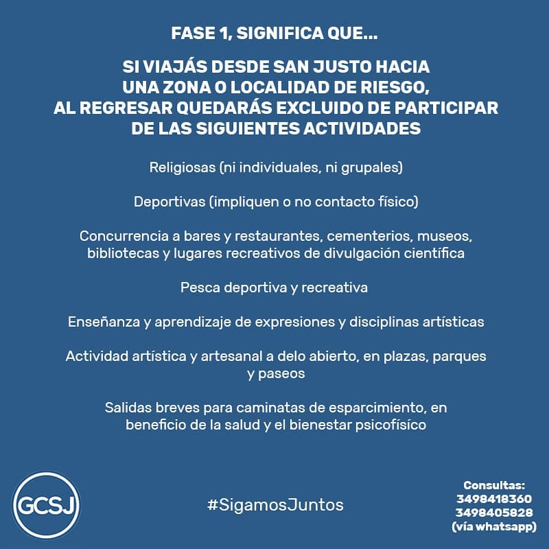 Si viajas desde San Justo hacia una zona o localidad de riesgo al regresar quedarás excluido de participar de las siguientes actividades: