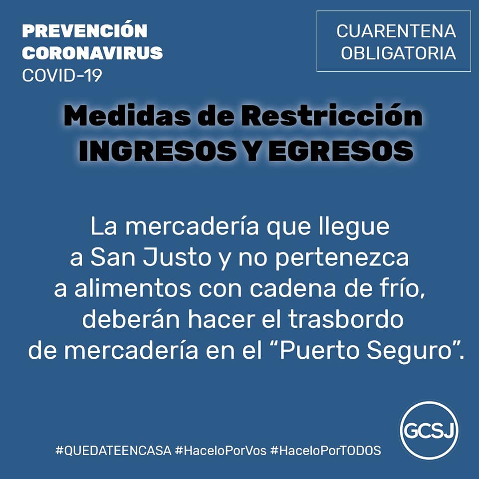 📌 Cualquier mercadería que llegue a San Justo a través de transportistas y no pertenezca a los alimentos que necesitan cadena de frío, deberán hacer el trasbordo de mercadería en el Puerto Seguro instalado por las autoridades locales en el predio industrial privado.