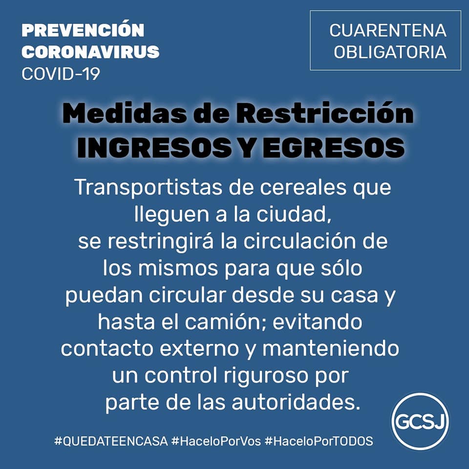 📌 Para los transportistas de cereales que lleguen a la ciudad. Se recalca que no podrán ingresar con el camión al ejido urbano y, además, se restringirá la circulación de los mismos para que sólo puedan circular desde su casa y hasta el camión; evitando contacto externo y manteniendo un control riguroso por parte de las autoridades. Utilizando, además, todas las medidas de seguridad y prevención pertinente.