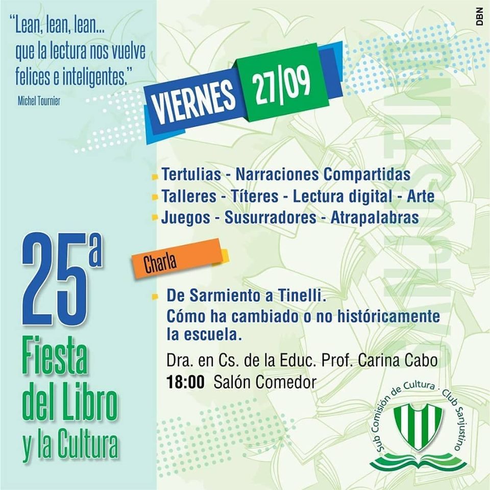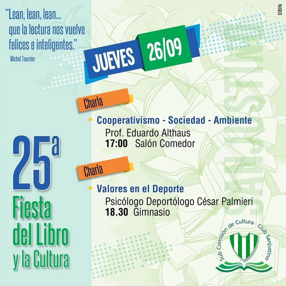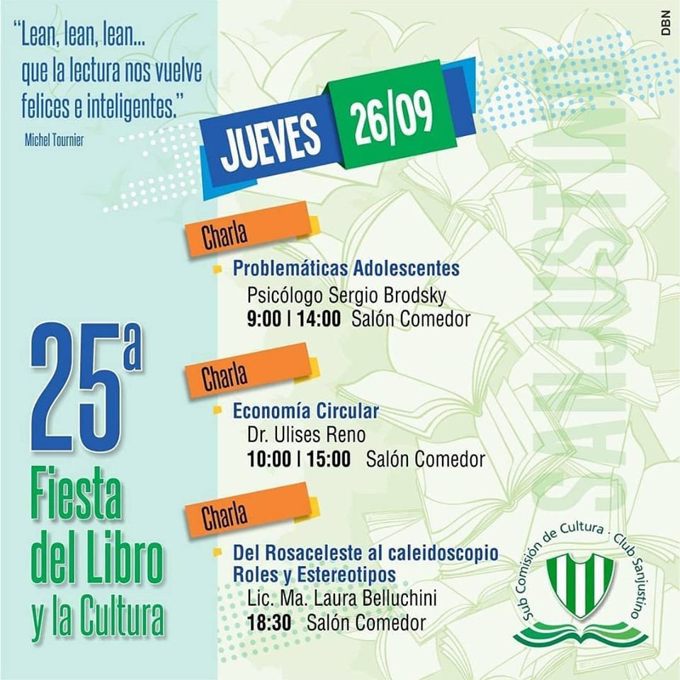 Hoy jueves 26 de septiembre comienza la 25° Edición de la Fiesta del Libro y la Cultura que organiza el Club Sanjustino. A continuación en galería de fotos damos a conocer el cronograma de las actividades, que se llevarán a cabo durante los dos días: