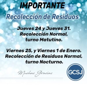 El Gobierno de la Ciudad de San Justo, informa que la recolección de residuos será normal el jueves 24 y jueves 31 en el turno matutino. El viernes 25 y el viernes 1° de enero la recolección será normal en el turno nocturno.