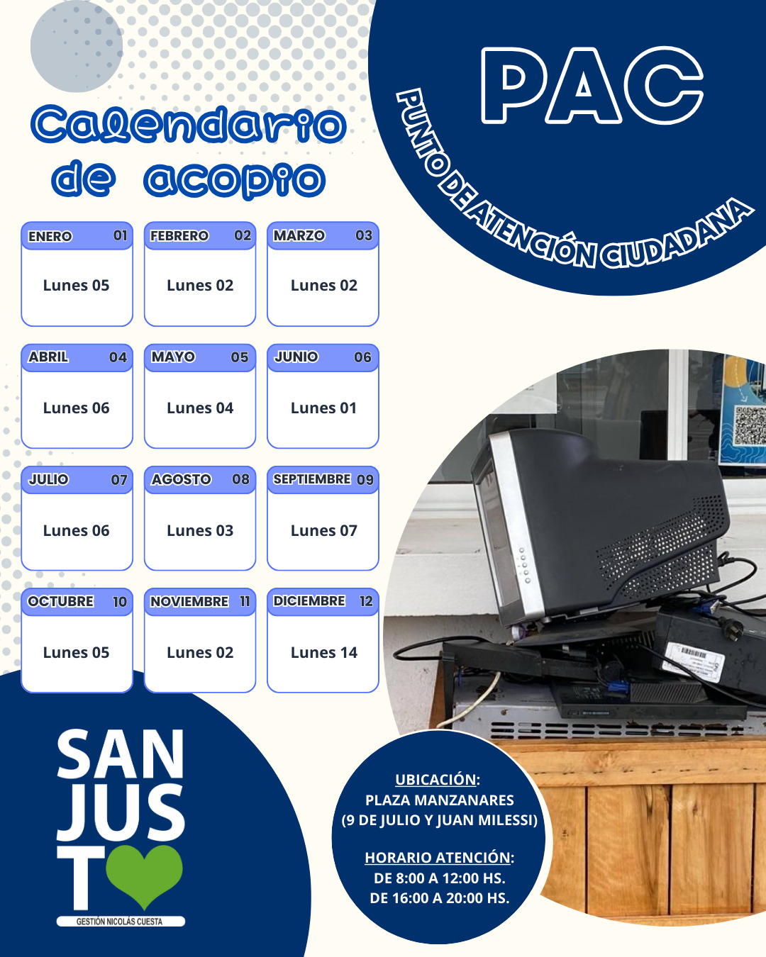 *El Gobierno de la Ciudad de San Justo realiza el acopio de residuos eléctricos y electrónicos (RAEE) el primer lunes de cada mes en el Punto de Ecocanje (Juan Milesi y 9 de Julio), de 9 a 12 y de 16 a 20 horas, gestionado por las áreas de ambiente y servicios públicos. El próximo acopio será el lunes 4 de mayo.