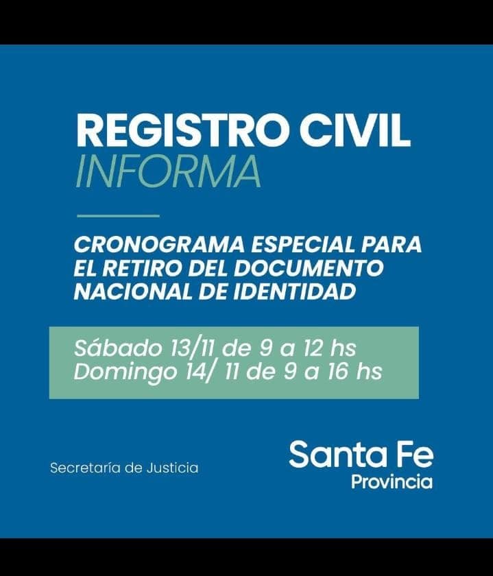 Con motivo del acto eleccionario del próximo domingo 14 de noviembre, el Registro Civil de la provincia de Santa Fe, ha dispuesto un cronograma especial de atención al público para el retiro de documentos de identidad: