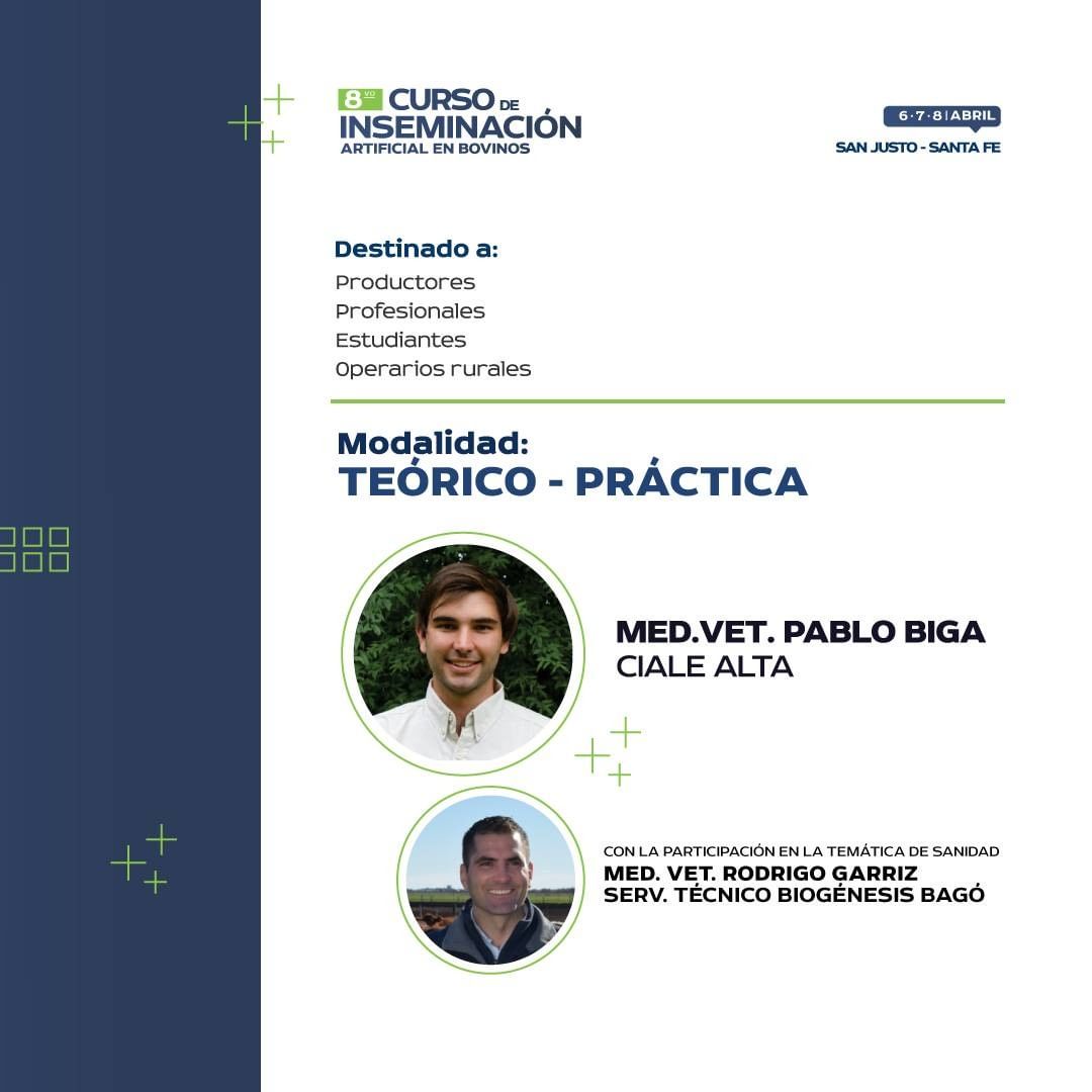 El curso se desarrolla en aula y manga. Estará a cargo del médico veterinario Dr. Pablo Biga de @ciale.alta.genetics junto a la participación del médico veterinario Rodrigo Garriz de @biogenesisbagoar.