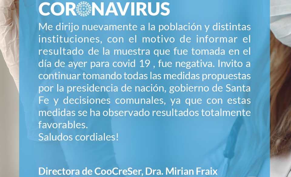Dio negativo el resultado del análisis del caso sospechoso de Coronavirus de Gobernador Crespo. Así lo hizo saber el Presidente Comunal de la localidad, Luciano Lemaire, a través de un comunicado que lleva la firma de la directora del nosocomio CooCreSer, Dra. Miriam Fraix
