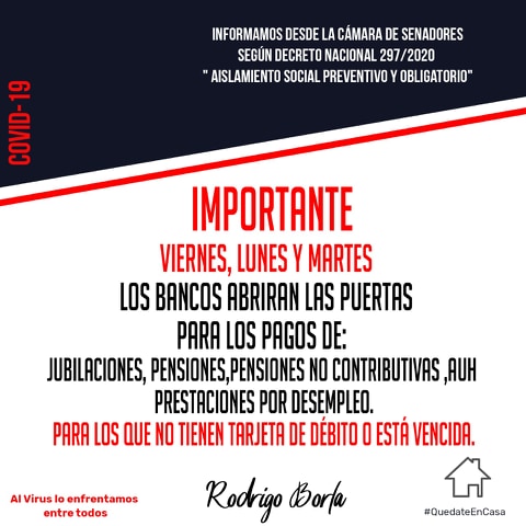 A su vez recuerda la apertura de los bancos a partir de mañana, para abonar haberes y beneficios a Jubilados, Pensionados, titulares de la AUH, Asignación por Embarazo y Prestaciones por Desempleo, para mayores precisiones ver galería de fotos.