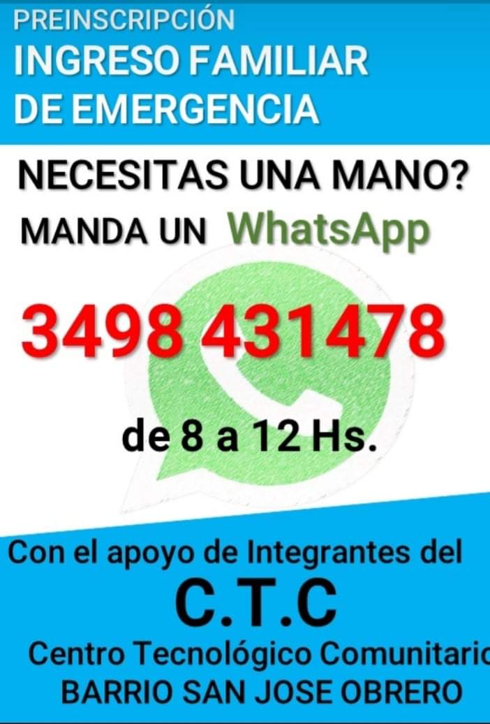 Con el objeto de colaborar con l@s beneficiari@s del INGRESO FAMILIAR DE EMERGENCIA que lleva adelante el Gobierno Nacional a través de ANSES, ponemos a disposición el contacto de WhatsApp 3498 431478 a fin de facilitar la Pre Inscripción que lleva adelante en estos momentos.