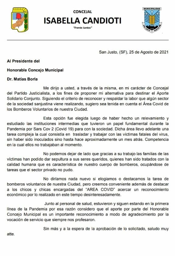 La Concejal Isabella Candioti consideró oportuno la entrega de esos aportes al Cuerpo de Bomberos Voluntarios, más precisamente a la Brigada Covid, personal voluntario que llevó adelante una tarea humanitaria, que permitió darle sepultura a aquellos fallecidos por Covid.