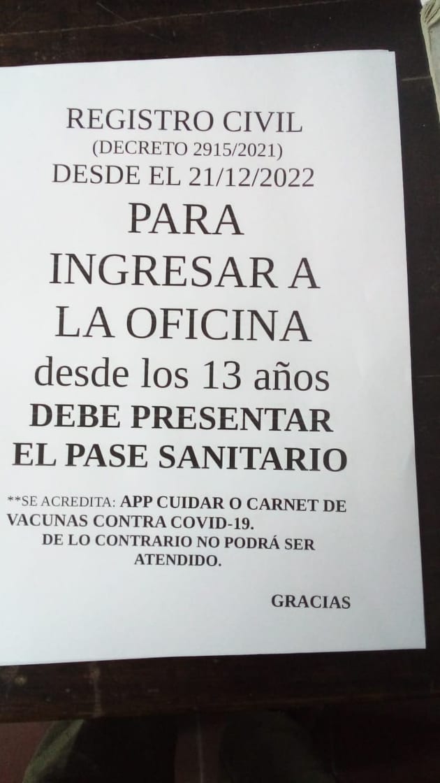 El Registro Civil de la ciudad de San Justo comunica que, desde este martes 21 de diciembre se exigirá el pase sanitario a toda persona a partir de los 13 años que concurra a realizar un trámite presencial a sus oficinas, conforme lo establece el Decreto Provincial N° 2915, de lo contrario no será atendido.