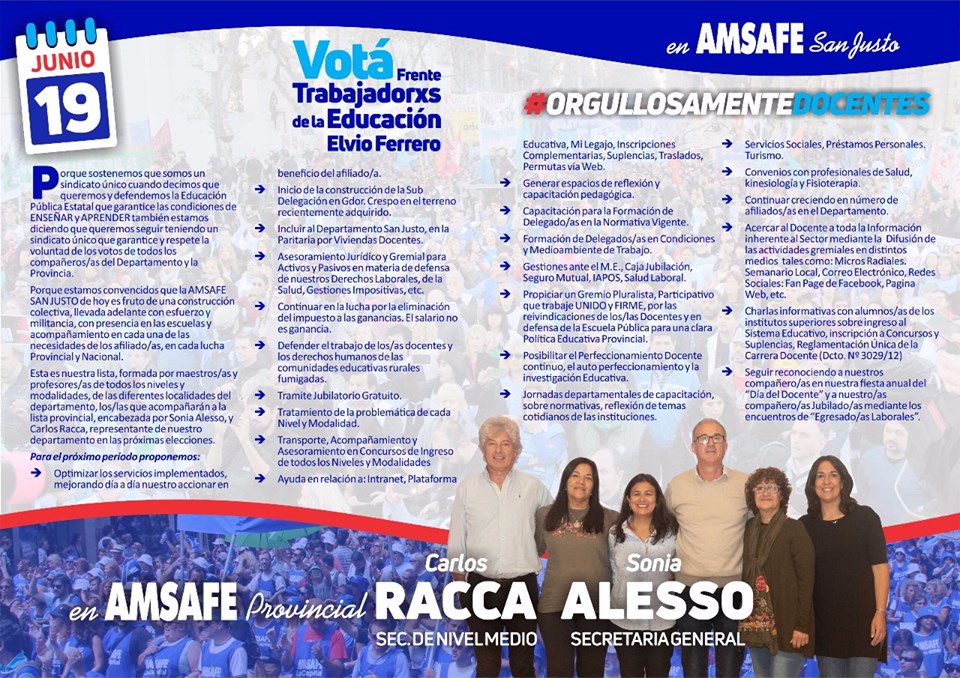 En el departamento San Justo se ha presentado la lista Frente Trabajadores de la Educación “Elvio Ferrero” – formada por Maestros y Profesores de todos los Niveles y Modalidades, de las diferentes localidades del Departamento, con Jorge “Palito” Debona como Delegado Seccional y Lorena Faisal como Deleg. Sec. Adjunta, que acompañarán a la Lista Provincial, encabezada por Sonia Alesso, y Carlos Racca, representante de nuestro Departamento en las próximas elecciones.