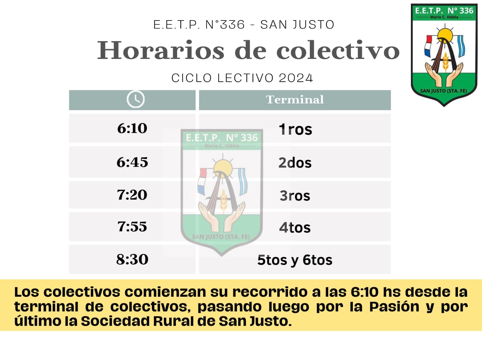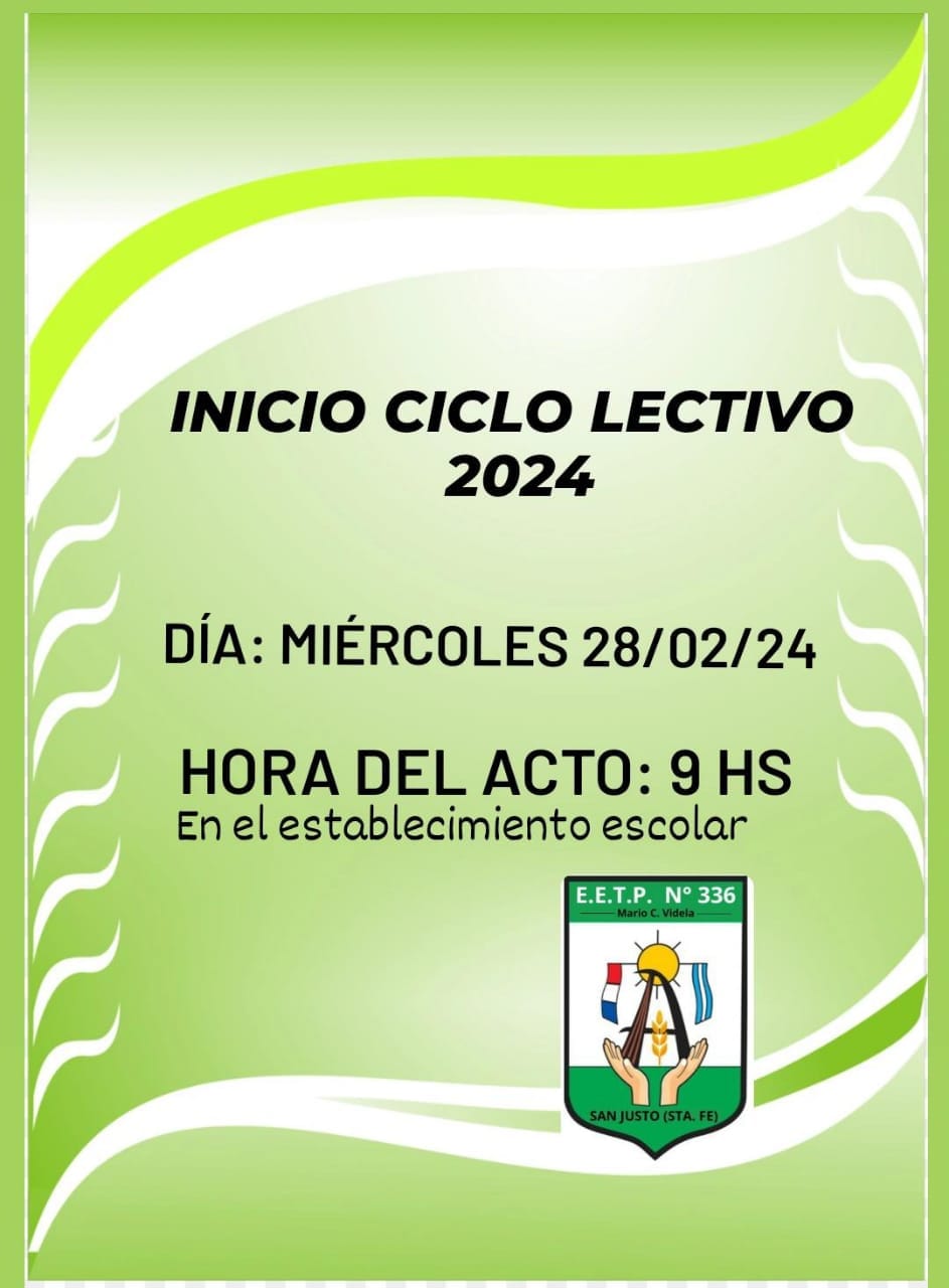 La dirección de la Escuela Agrotécnica N° 336 “Mario C. Videla” comunica que el acto de inicio del ciclo lectivo 2024 se realizará el miércoles a las 9 horas, en el establecimiento escolar. También ha dispuesto el horario y recorrido del colectivo que lleva a los alumnos, verificar los mismos en la galería de imágenes