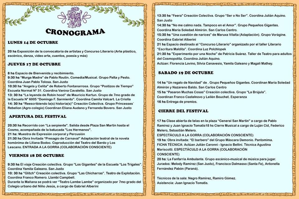 🎭🥳 Compartimos con ustedes el cronograma de actividades que tendrá la 28° Edición del “Festival de Arte” de San Justo, desde el lunes 14 hasta el sábado 19 de octubre.