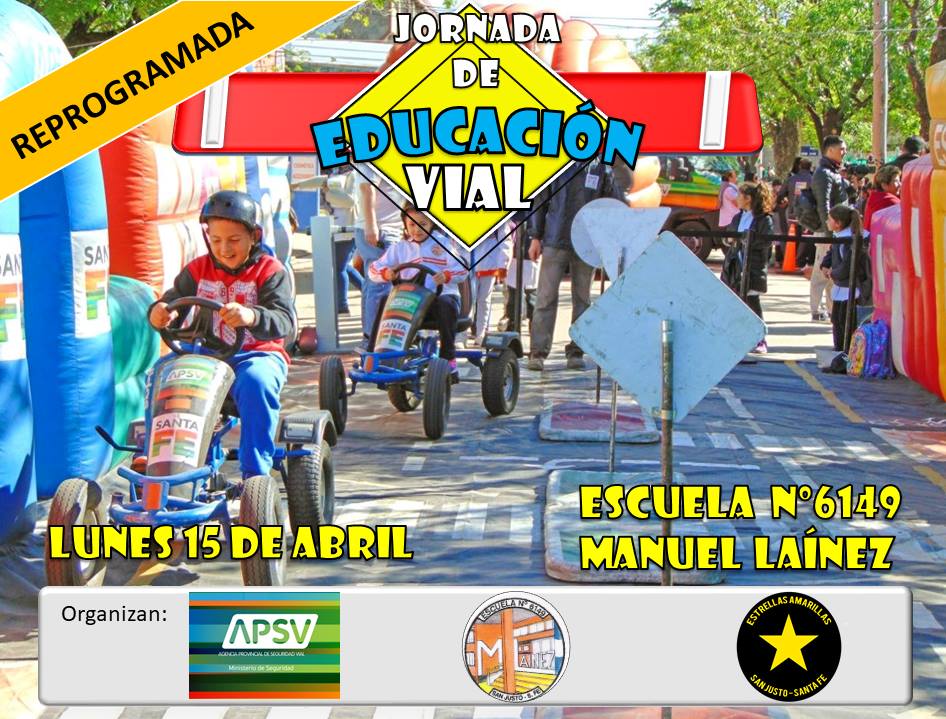 Ante las medidas de fuerza dispuesta por la docencia santafesina, comunicamos que la actividad prevista para el jueves 4 de abril, queda postergada para el día lunes 15 de abril. Esta jornada de Educación vial está destinada a alumnos de la Escuela 6149 Manuel Láinez y se desarrollará en un circuito provisto por la Agencia Provincial de Seguridad Vial (APSV).