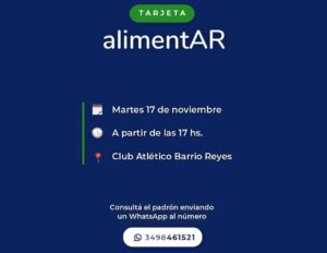 El subsecretario de Políticas de Inclusión y Desarrollo Territorial de la provincia de Santa Fe, Santiago Felipoff, anunció que este martes 17 de noviembre a las 17 horas en el Club Barrio Reyes se llevará a cabo una nueva entrega de Tarjetas Alimentar.