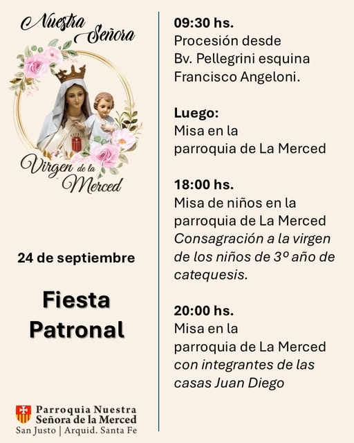 Hoy 24 de septiembre San Justo celebra a su Santa Patrona, Nuestra Señora de la Merced. Dejamos cronograma de actos para la comunidad.