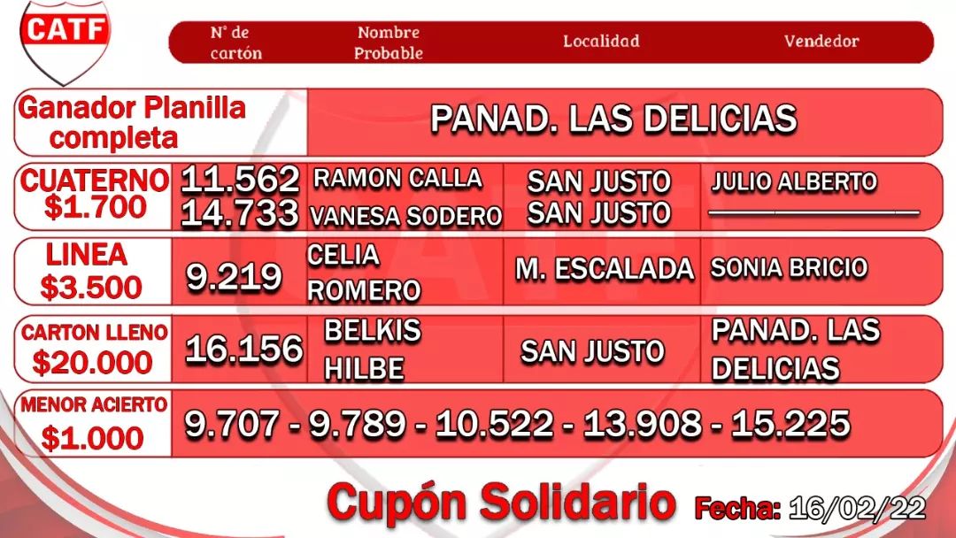 Este miércoles se realizó un nuevo sorteo del Cupón Solidario del Club Atlético Tiro Federal. Nómina de ganadores: