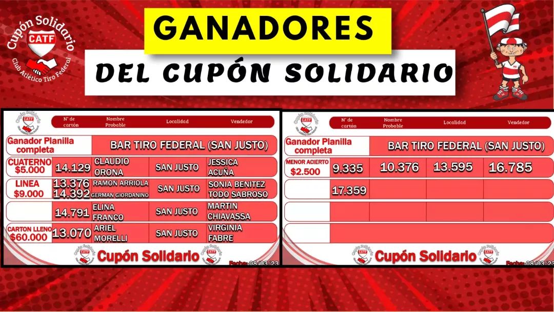 -Cartón Lleno – $60.000: cupón nº 13070 – ganador Ariel Morelli (San Justo).