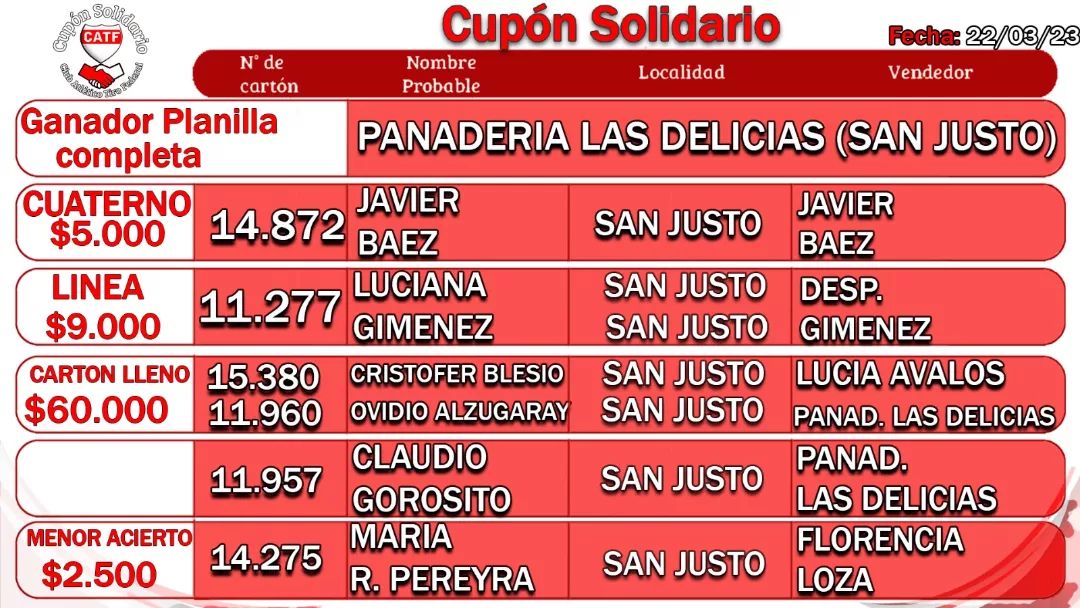 Cartón Lleno – $60.000: 3 ganadores cupón nº 15380 – Cristofer Blesio, cupón nº 11960 – Ovidio Alzugaray y cupón nº 11957 – Claudio Gorosito (San Justo)