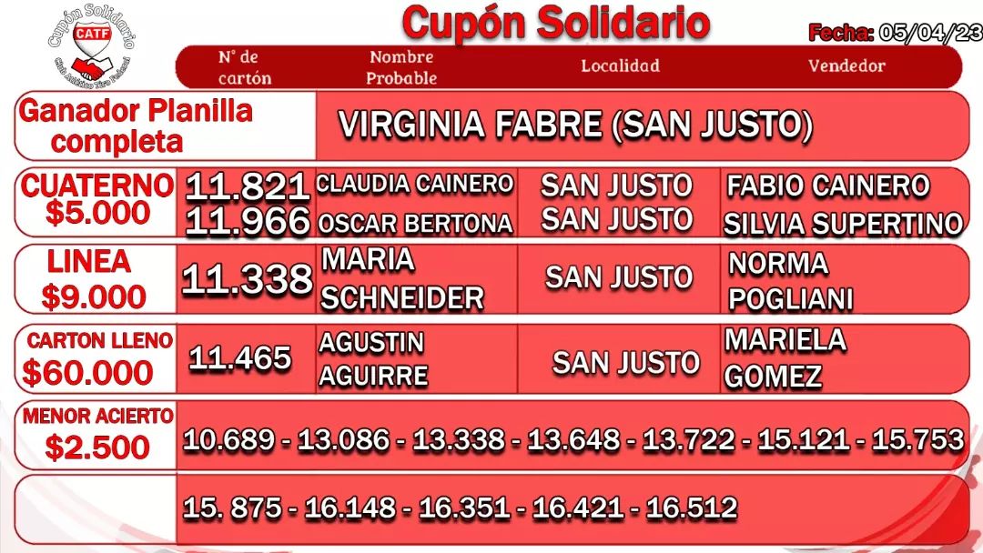 - Cuaterno – $5.000: Claudia Cainero y Oscar Bertona.