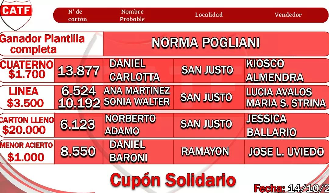 Ganadores del sorteo del Cupón Solidario del Club Atlético Tiro Federal